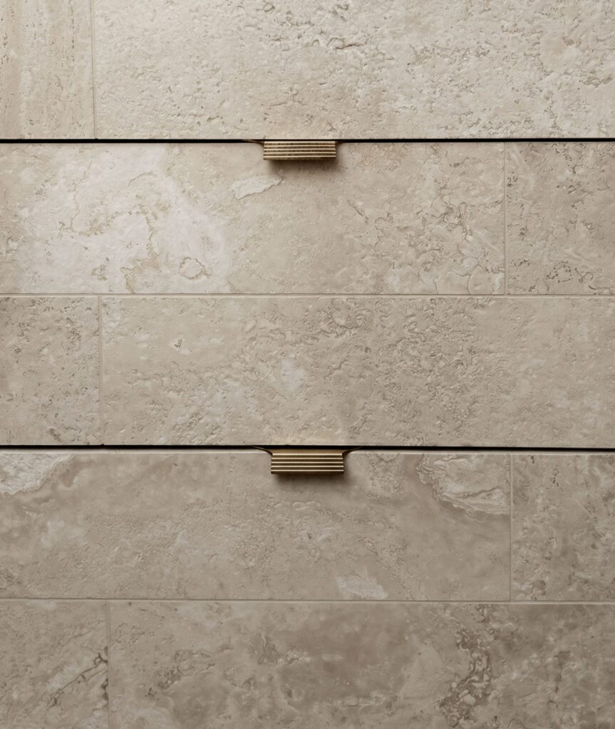 // Woodgrain, honed stone and ribbed cabinetry